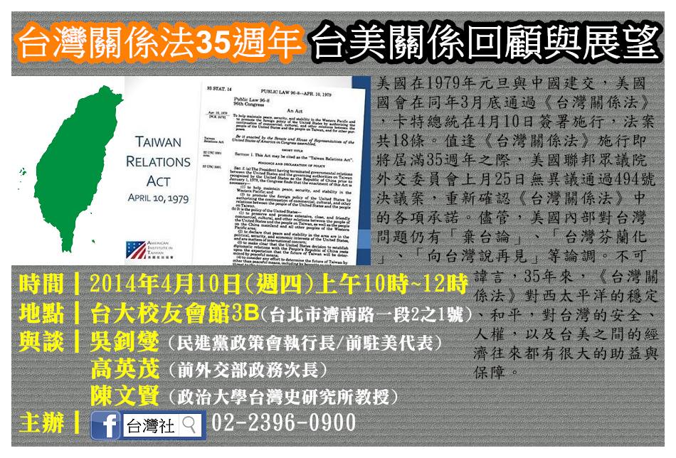 【時間】2014年4月10日(週四)上午10時~12時 【地點】台大校友會館3B (台北市濟南路一段2之1號) 【與談】吳釗燮 (民進黨政策會執行長/前駐美代表) 高英茂 (前外交部政務次長) 陳文賢 (政治大學台灣史研究所教授) 【主辦】台灣社 02-2396-0900 美國在1979年元旦與中國建交,美國國會在同年3月底通過《台灣關係法》,卡特總統在4月10日簽署施行,法案共18條。值逢《台灣關係法》施行即將屆滿35週年之際,美國聯邦眾議院外交委員會上月25日無異議通過494號決議案,重新確認《台灣關係法》中的各項承諾。儘管,美國內部對台灣問題仍有「棄台論」、「台灣芬蘭化」、「向台灣說再見」等論調。不可諱言,35年來,《台灣關係法》對西太平洋的穩定、和平,對台灣的安全、人權,以及台美之間的經濟往來都有很大的助益與保障。 1. 檢視台灣關係法內容 2. 美中三公報與台灣關係法的關係 3. 台灣關係法與美國對台政策 4. 美國重返亞洲策略
