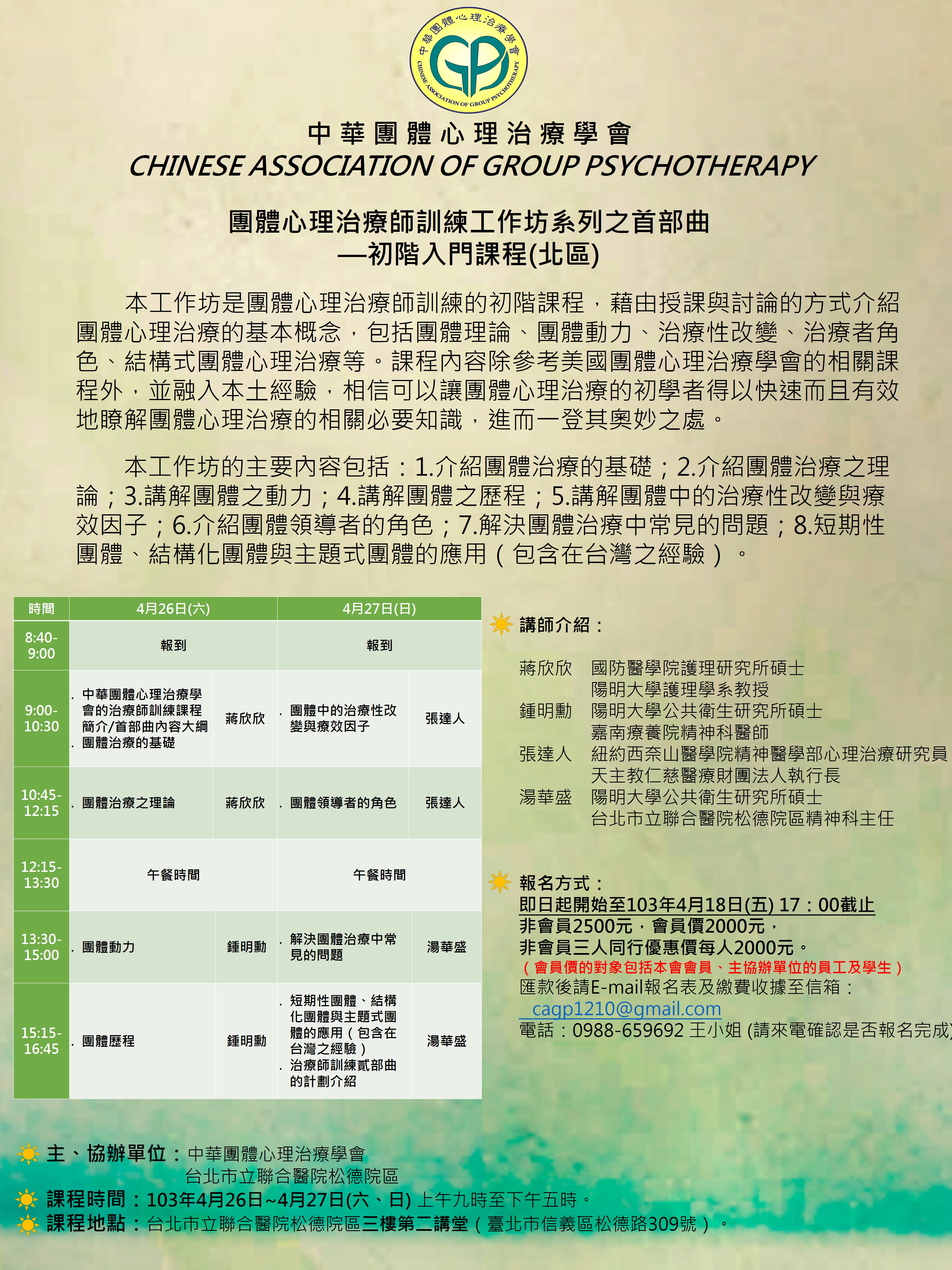◎主、合辦單位:中華團體心理治療學會、台北市立聯合醫院松德院區。