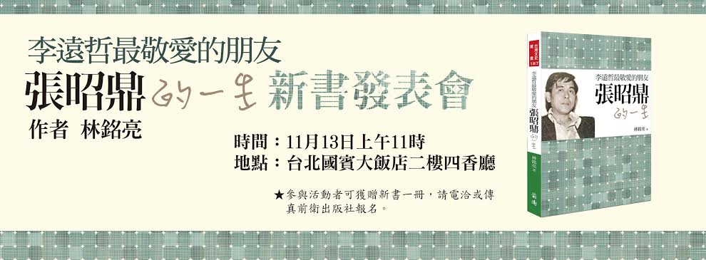 《李遠哲最敬愛的朋友—張昭鼎的一生》新書發表會 ▲時間:11月13日上午11時 ▲地點:台北國賓大飯店二樓四香廳 ▲主辦:張昭鼎紀念基金會、前衛出版社 本活動需報名參加,參與活動可獲贈《李遠哲最敬愛的朋友—張昭鼎的一生》新書乙冊,請以電話或傳真前衛出版社報名。 ◎電話:(02)25865708.25863776 ◎傳真:(02)25863758 ------------------ 張昭鼎教授,1933年生於台南,在台大求學期間,與相差兩屆的李遠哲先生成為好友,其化學領域研究卓然有成,不但開創了國內近代無機化學的研究先河,更提升了國內核子化學的水平。 然而,張教授除了化學研究方面的貢獻以外,我們更能從其一生看見二次世界大戰結束後,變動年代中台灣社會的轉變,以及懷抱熱血的知識份子置身其中,如何奮鬥與掙扎的身影。張教授對獨裁高壓統治內心反抗之信念、左派閱讀、科學家求真的風格、不妥協但善予折衝的台灣老紳士個性,透過林銘亮先生的著作《李遠哲最敬愛的朋友—張昭鼎的一生》,我們將能對這位重要的化學研究者,以及一代知識份子有更多了解。 張昭鼎紀念基金會將於11月13日上午11時於台北國賓大飯店二樓四香廳舉行由林銘亮先生著作的《李遠哲最敬愛的朋友—張昭鼎的一生》新書發表會,張昭鼎生前好友中央研究院前院長李遠哲院士及前教育部長黃榮村博士及張昭鼎紀念基金會董事長廖俊臣教授等將親自出席此一發表會,並將致詞表達對這位摯友的深切懷念與敬意。